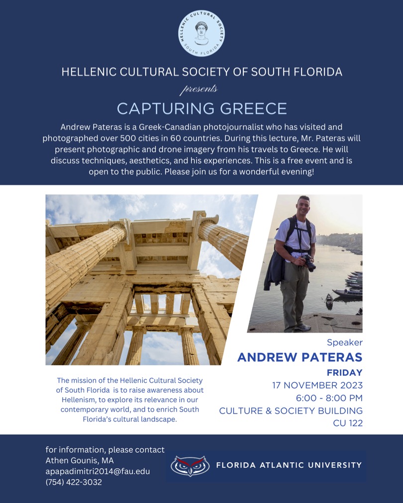 Andrew Pateras is a Greek-Canadian photojournalist who has visited and photographed over 500 cities in 60 countries. During this lecture, Mr. Pateras will present photographic and drone imagery from his travels to Greece. He will discuss techniques, aesthetics, and his experiences. This is a free event and is open to the public. Please join us for a wonderful evening!
